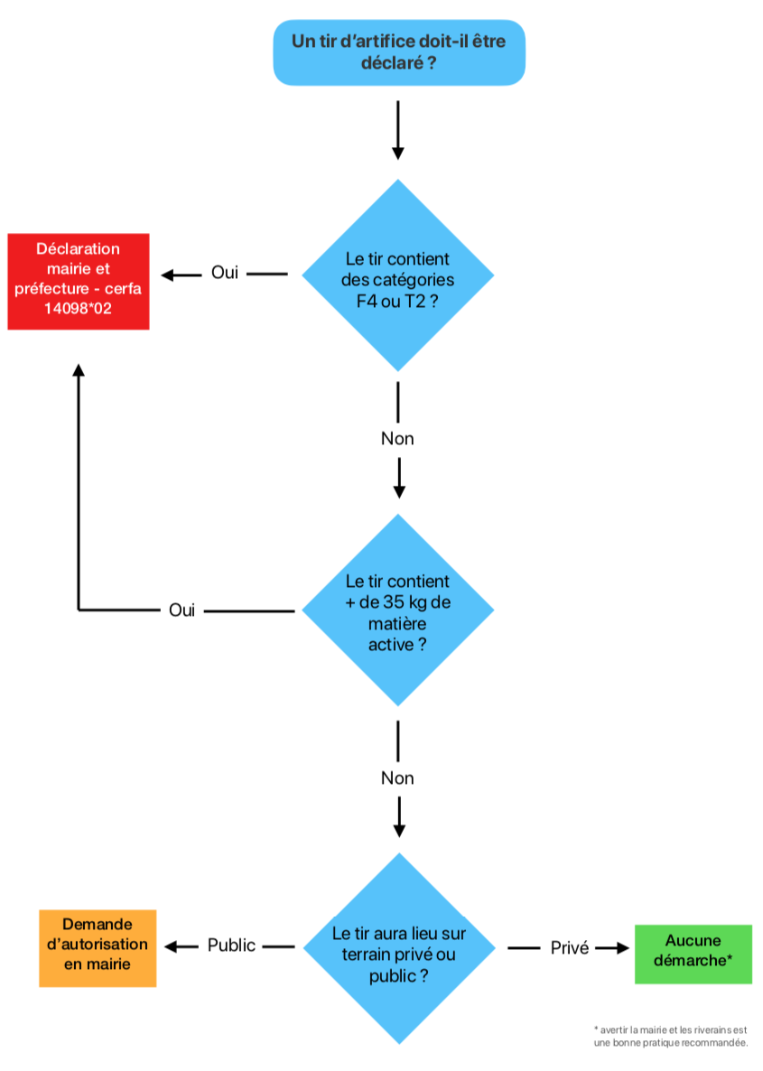 La question revient sans cesse et pour cause. L'Etat a cadré le cas de figure du spectacle pyrotechnique (présence de produit F4, de T2, ou de + de 35kg de MA), mais que ce passe t'il dans tous les autres cas ?